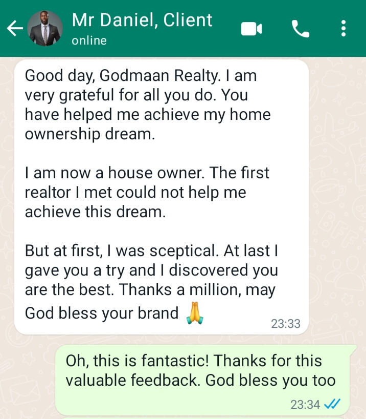 My name is Olanrewaju Joseph, I am the CEO of Godmaan Realty. I am a Business owner and Real Estate Consultant. I have a passion for helping people transit from tenancy to being a property owner themselves. I also love to see people build wealth through real estate investments. I partner with real estate developers to bring you the best investment deals in Real estate. I also assist in the process of searching and acquiring the perfect home for you. Or should you need a land to build one, Godmaan Realty is a good call.